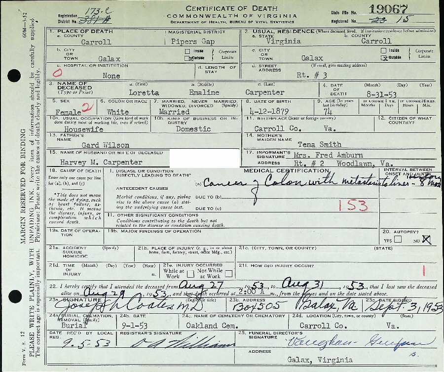 Died: August 31, 1953 in Pipers Gap, Carroll County, Virginia.