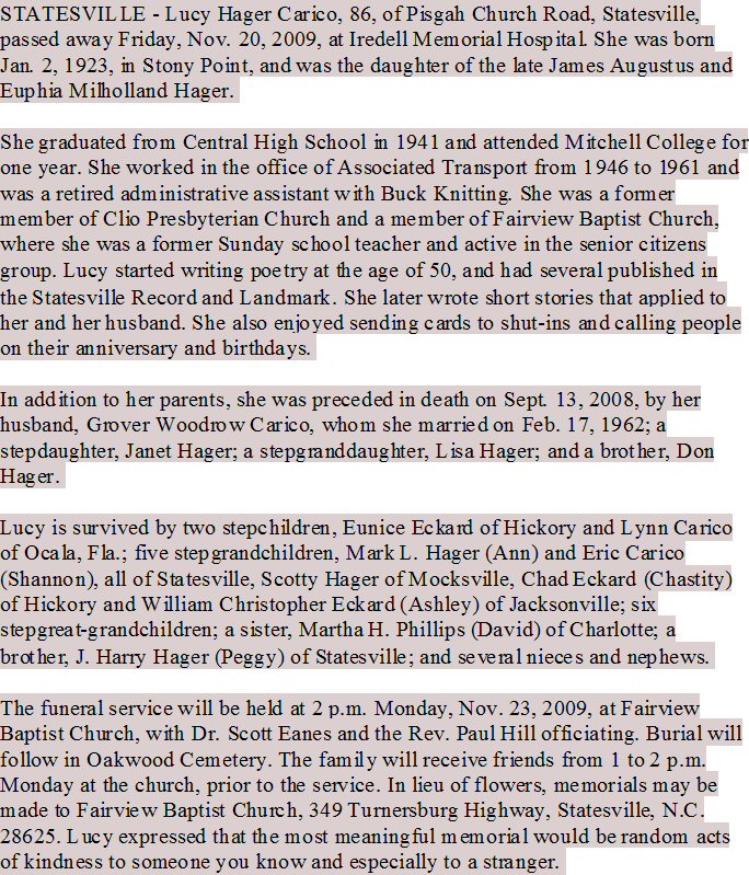 Notes for LUCY HAGER CARRICO: