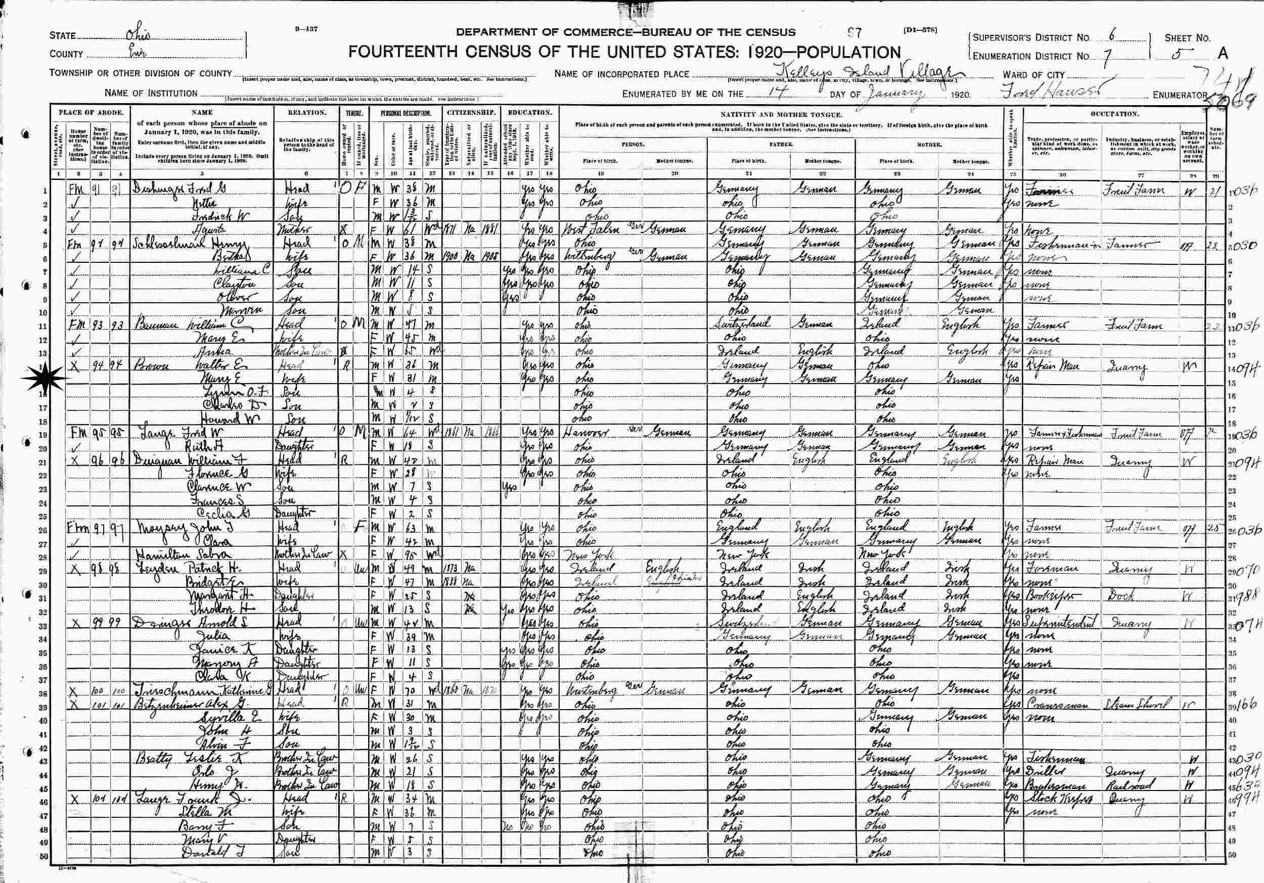 January 14, 1920 - Supervisor's District 6, Enumeration District 7, Kelleys Island Village, Erie County, Ohio.