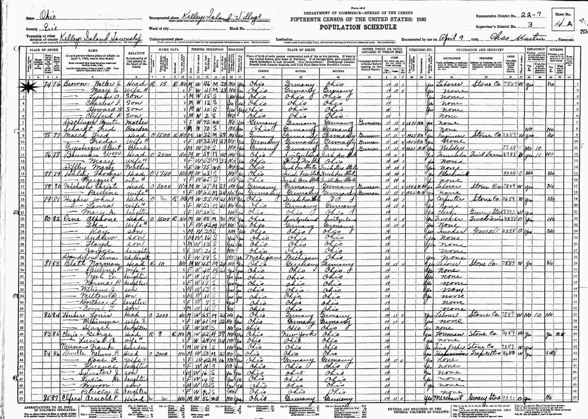 April 9, 1930 - Supervisor's District 3, Enumeration District 22-7, Kelleys Island Village, Kelleys Island Township, Erie County, Ohio.