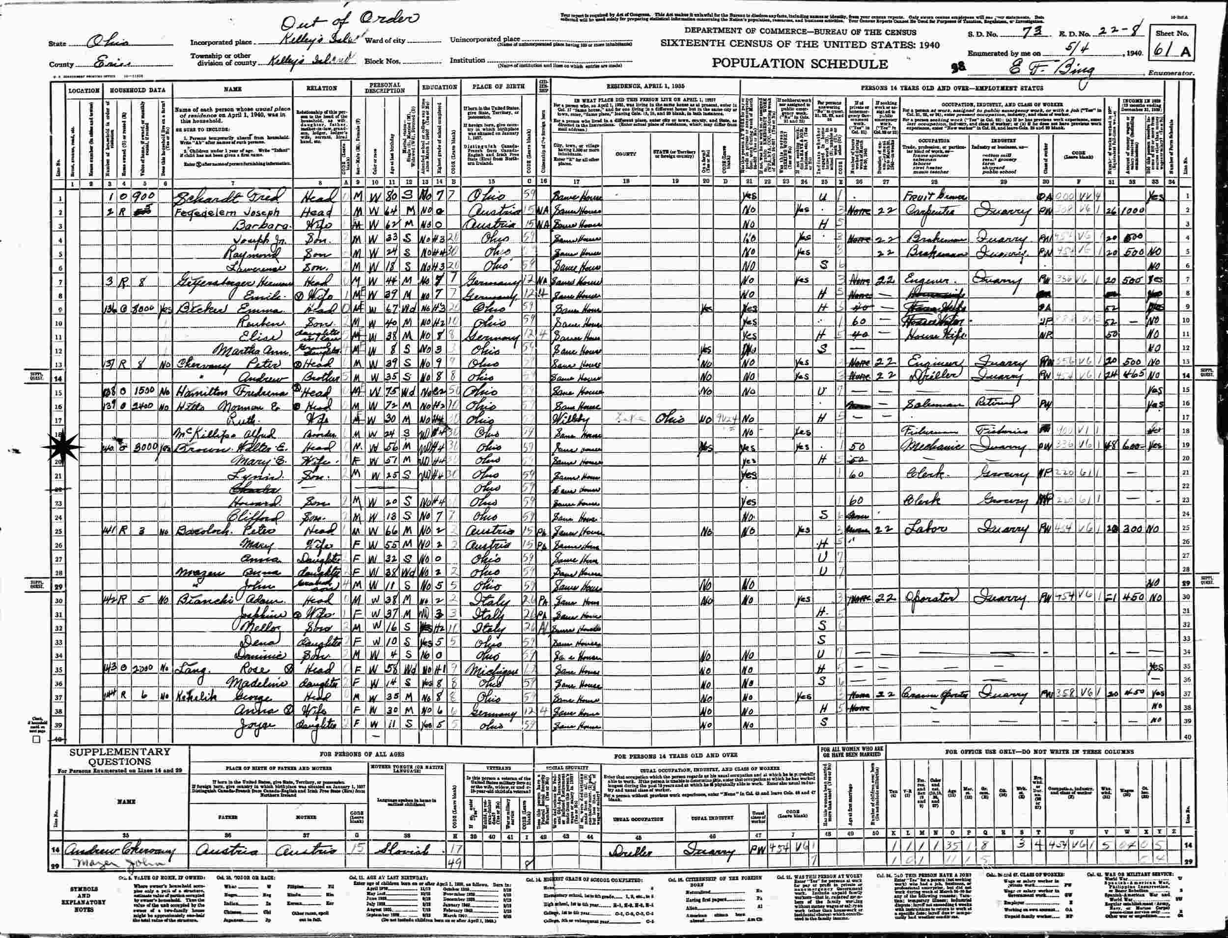 May 4, 1940 - Supervisor's District 73, Enumeration District 22-8, Kelly's Island, Erie County, Ohio.