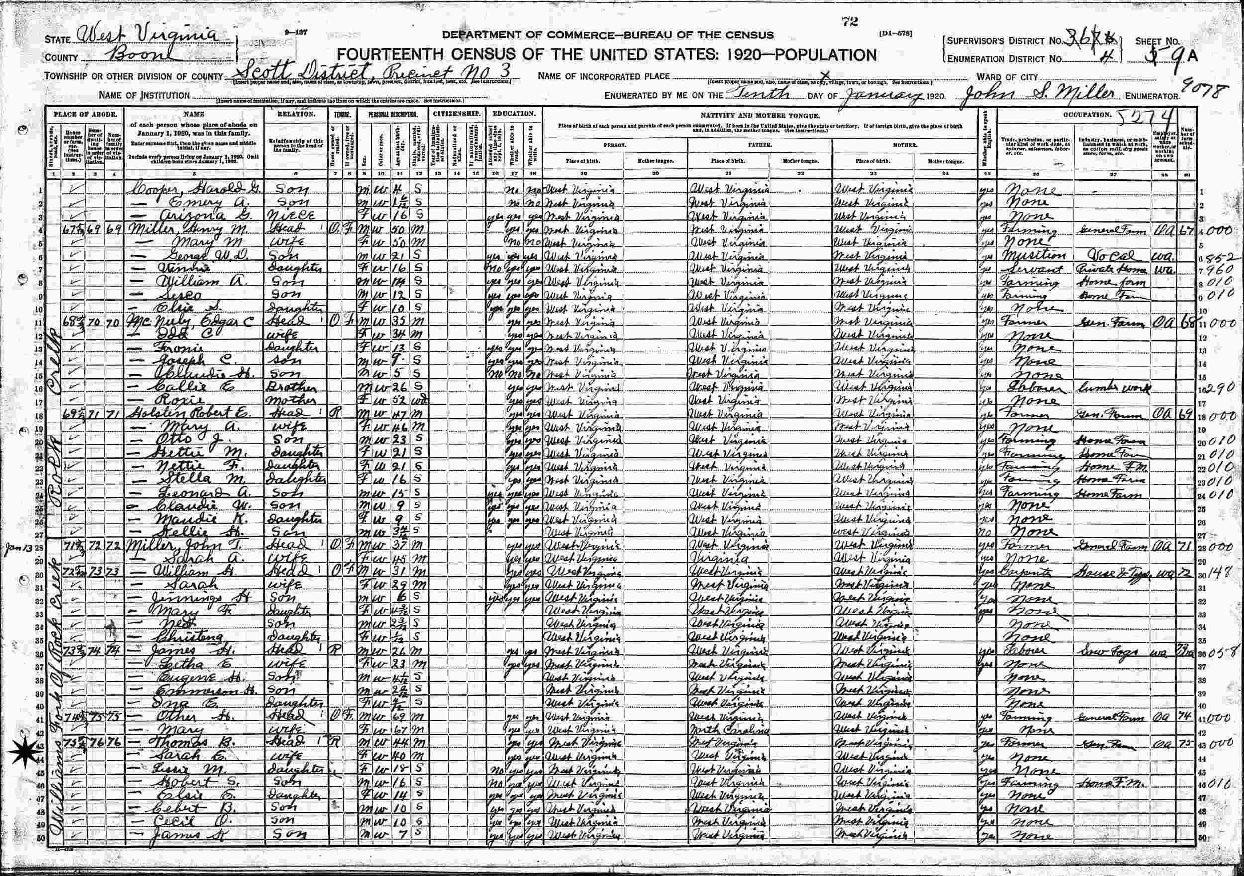 January 10, 1920 - Williams Fork of Rock Creek, Precinct 3, Supervisor's District 367 (crossed out to 6), Enumeration District 4, Scott District, Boone County, West Virginia.