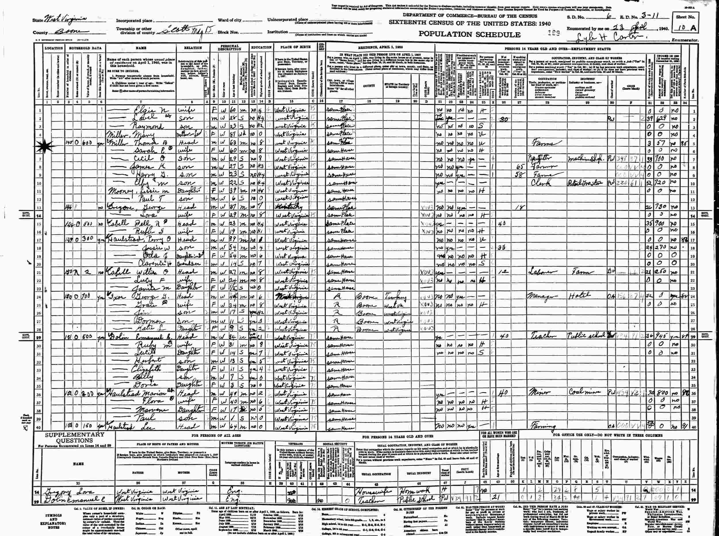April 23, 1940 - Supervisor's District 6, Enumeration District 3-11, Scott District, Boone County, West Virginia (w/parents).
