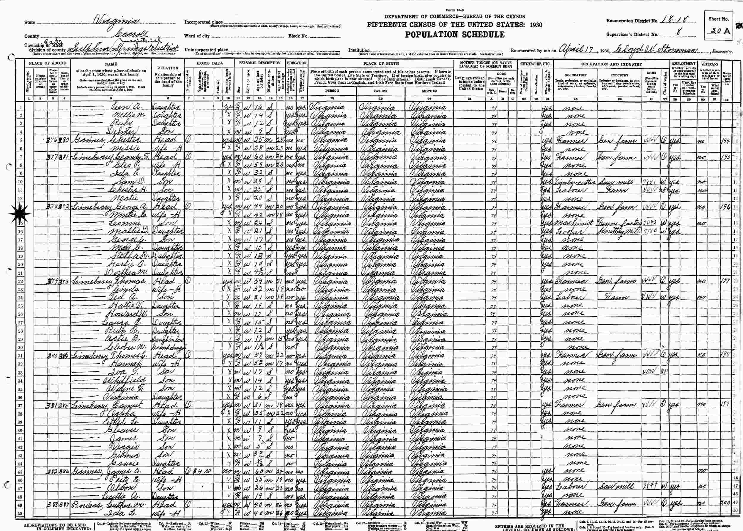 April 17, 1930 - Sulphur Springs Magisterial District, Supervisor's District 8, Enumeration District 18-18, Carroll County, Virginia.