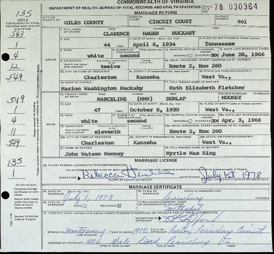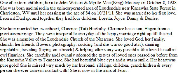 Married: (1) Leonard Dunlap May 8, 1948 in Loundondale, Kanawha County, West Virginia.