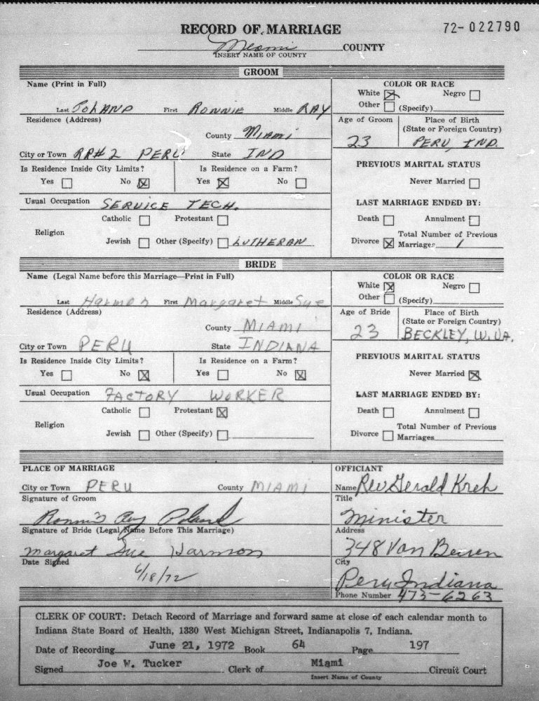 Married: (1) Ronnie Ray Poland June 18, 1972 in Peru, Miami County, Indiana. (Divorce: Before April, 1977.)