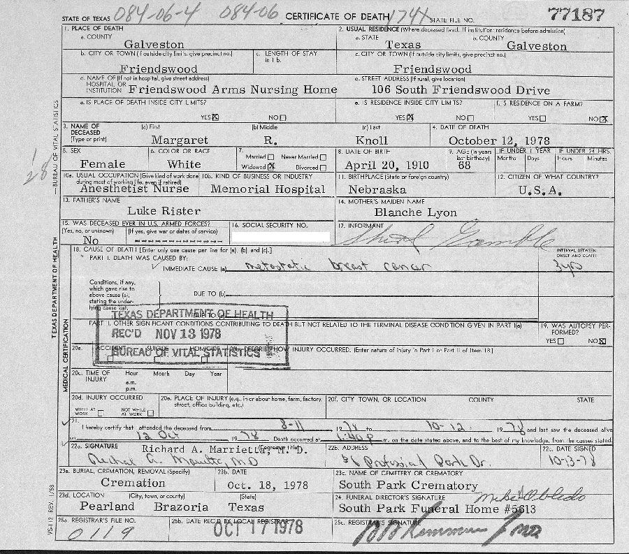 Died: October 12, 1978 in Friendswood Arms Nursing Home, Friendswood, Galveston, Texas.