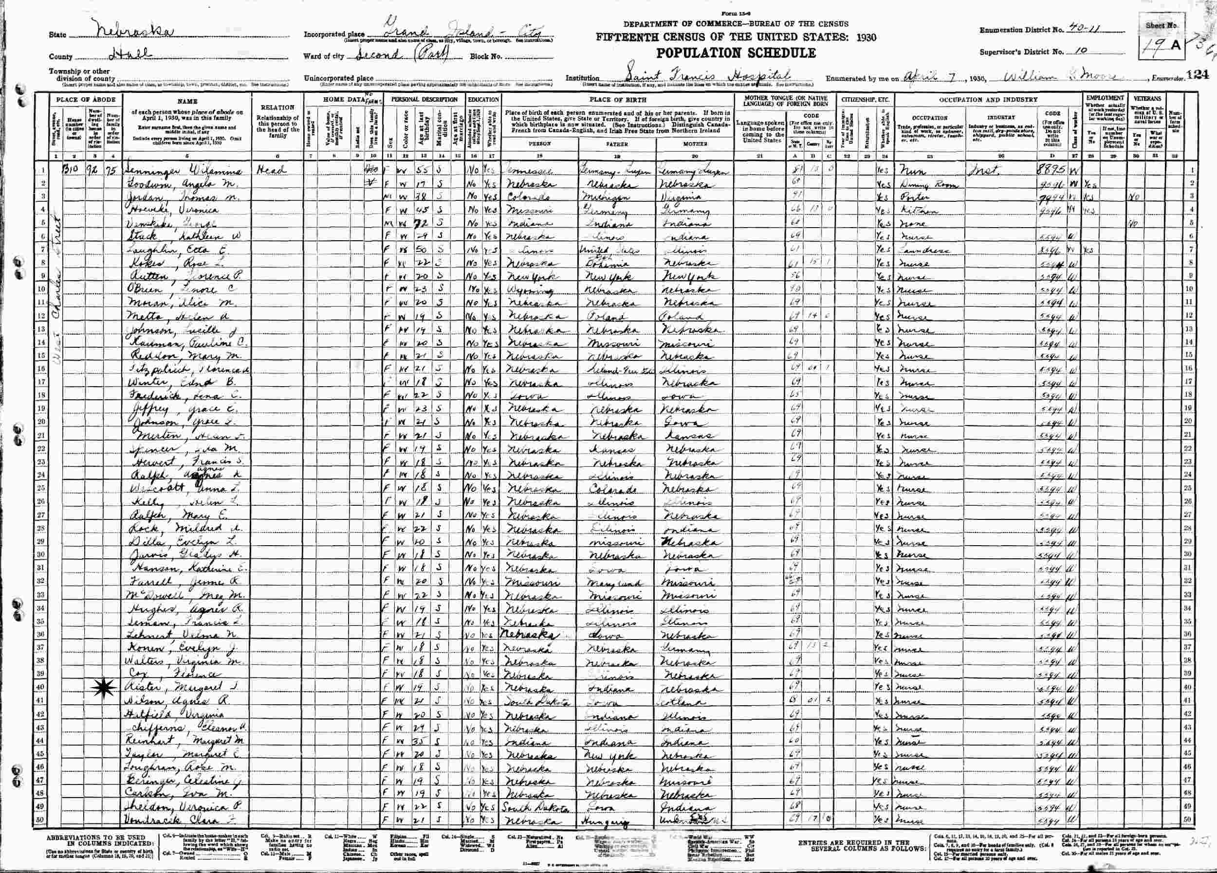 April 7, 1930 - Saint Francis Hospital, 1310 West Charles Street, 2nd Ward, Supervisor's District 10, Enumeration District 40-11, Grand Island, Hall County, Nebraska.