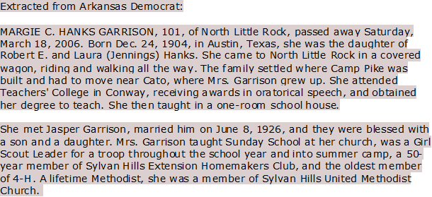 Notes for MARGIE CATHERINE HANKS GARRISON: