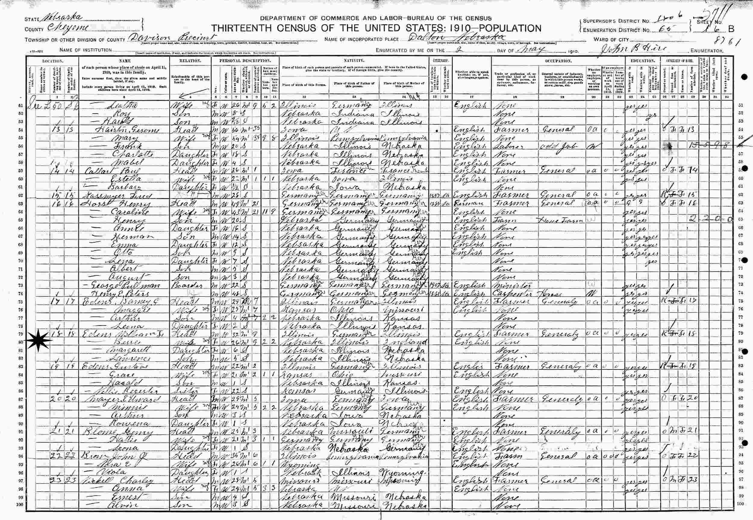 May 2, 1910 - Supervisor's District 170 (crossed out to 6), Enumeration District 65, Davison Precinct, Cheyenne County, Nebraska.