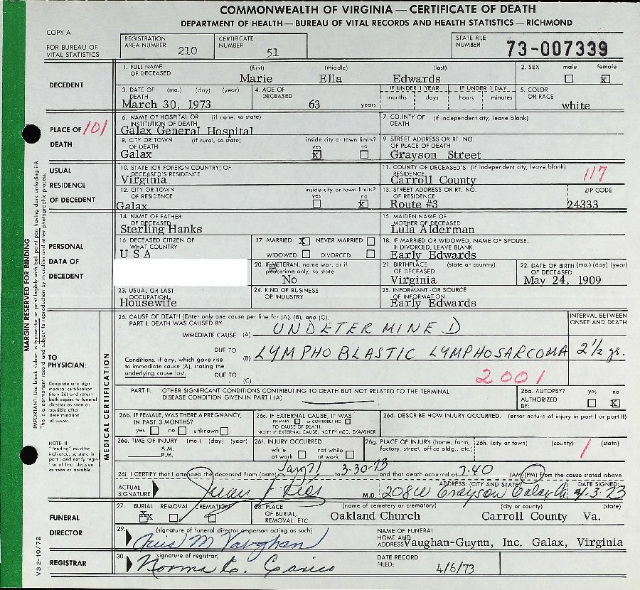 Buried: Oakland United Methodist Church Cemetery, Carroll County, Virginia.