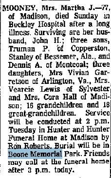 Buried: Boone Memorial Park, Madison, Boone County, West Virginia.