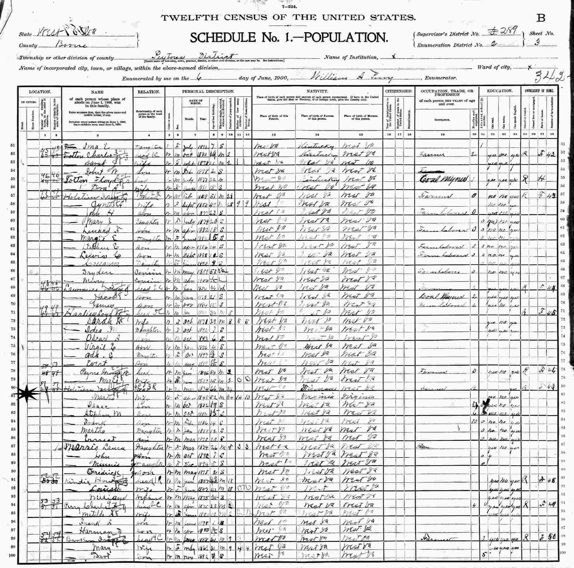 June 6, 1900 - Supervisor's District 3 (crossed out to 289), Enumeration District 2, Peytona District, Boone County, West Virginia.