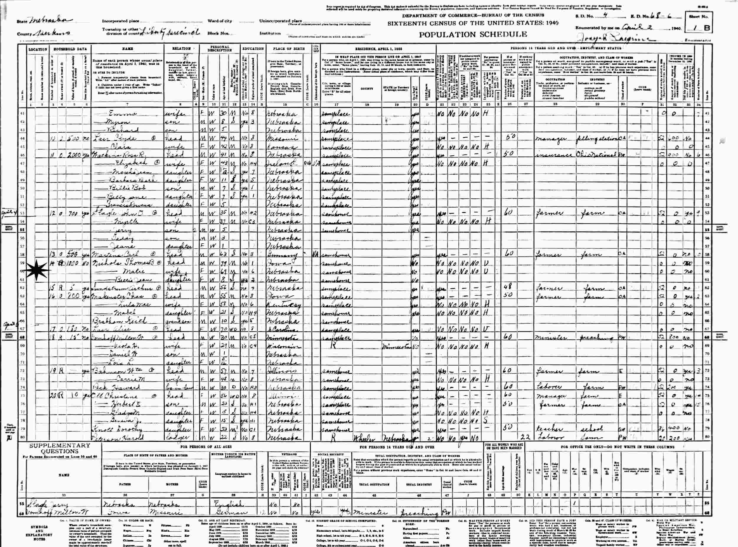 April 4, 1940 - Supervisor's District 4, Enumeration District 68-6, Liberty Precinct, Perkins County, Nebraska.