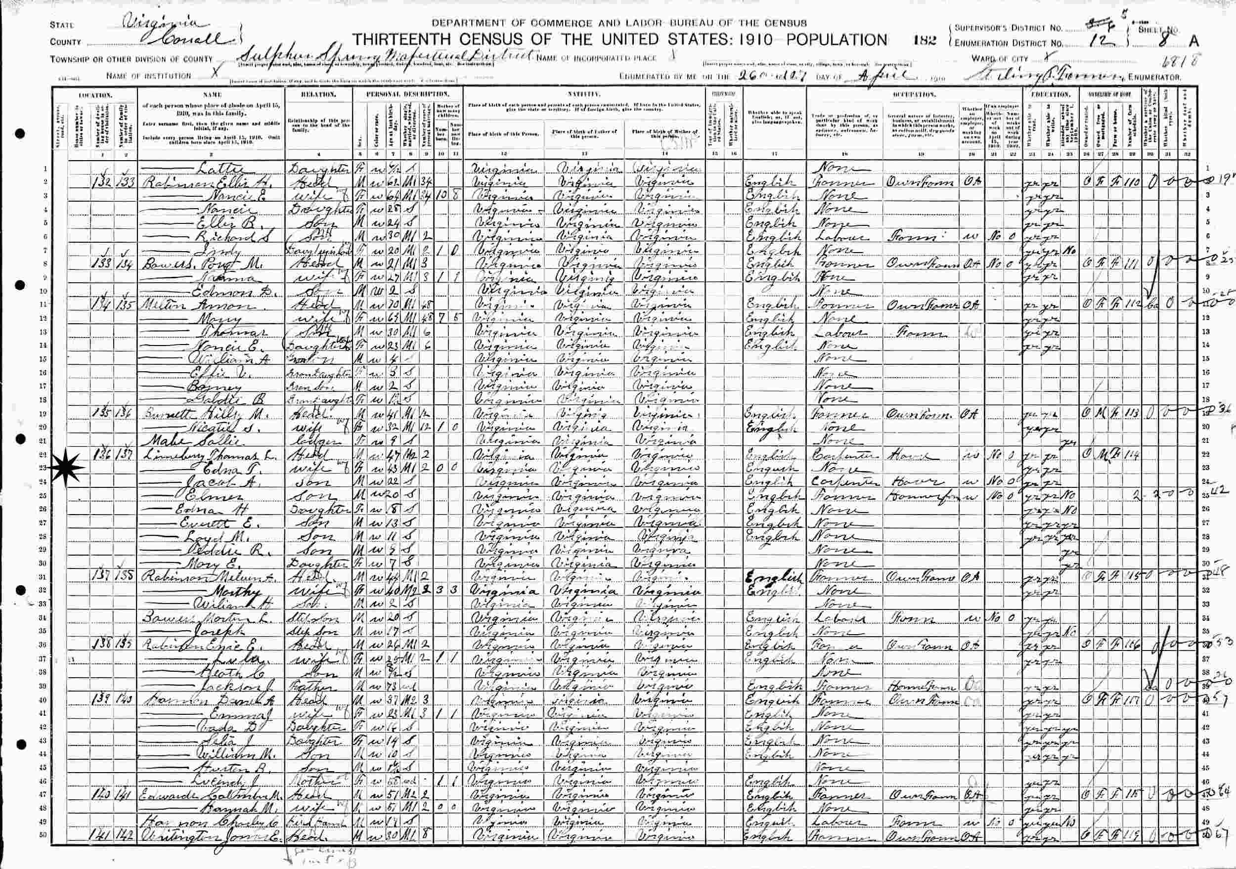 April 26-27, 1910 - Supervisor's District 5, Enumeration District 12, Sulphur Spring Magisterial District, Carroll County, Virginia.