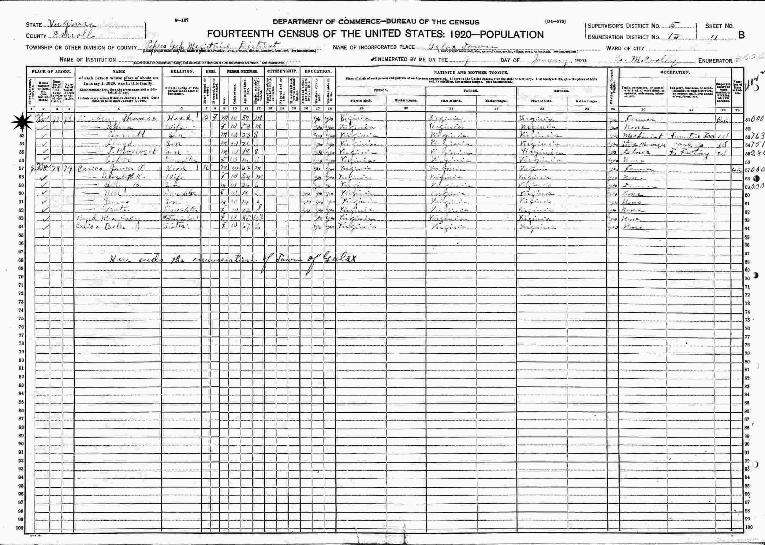 January 9, 1920 - Pipers Gap Magisterial District, Supervisor's District , Enumeration District 13, Galax, Carroll County, Virginia.