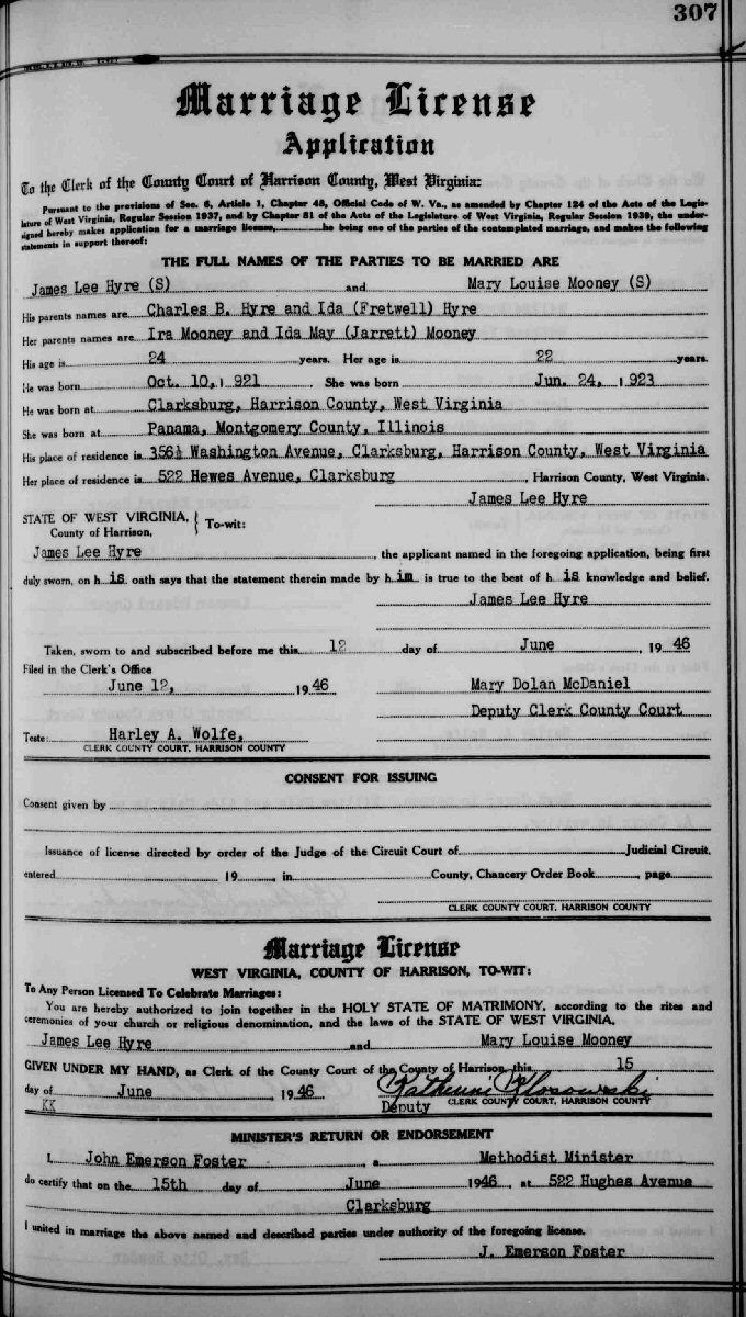 Married: James Lee Hyre, Sr. June 15, 1936 in Harrison County, West Virginia.