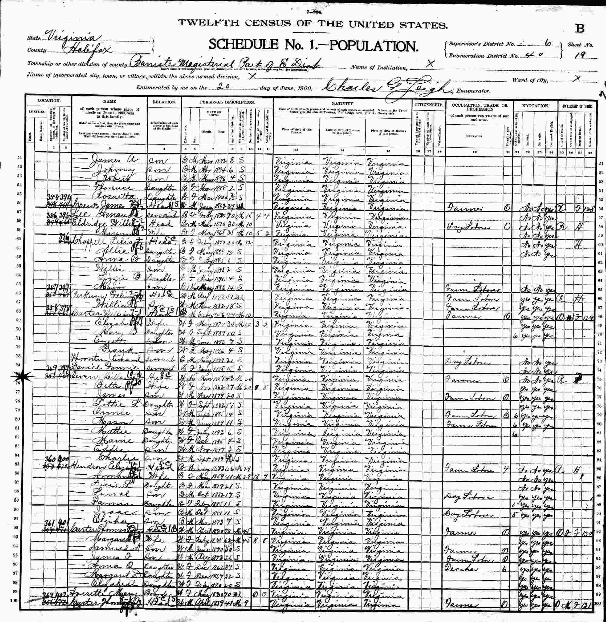 June 20, 1900 - Supervisor's District 6, Enumeration District 40, Bannister Magisterial District, Halifax County, Virginia.