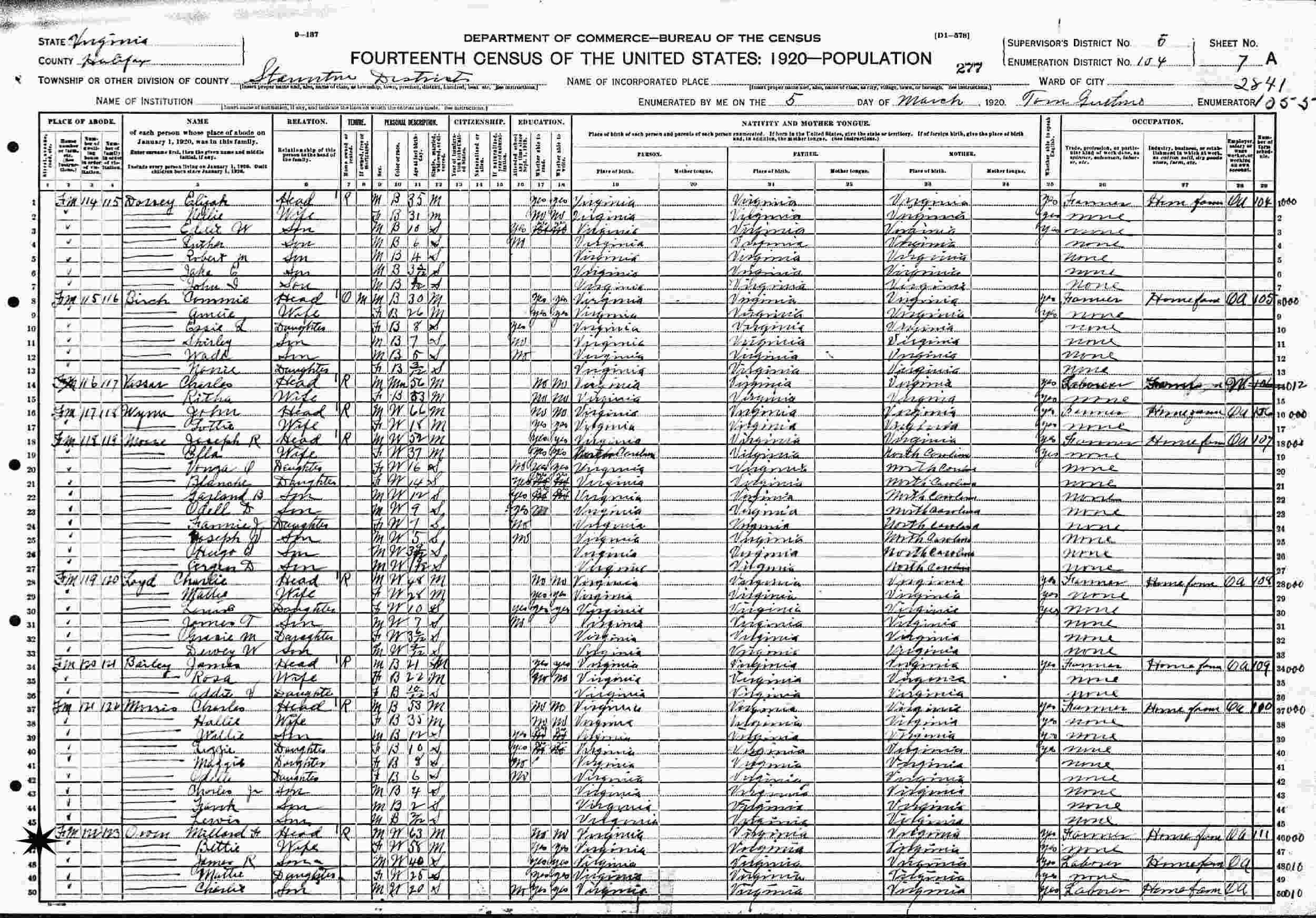 March 5, 1920 - Supervisor's District 5, Enumeration District 104, Staunton, Halifax County, Virginia.