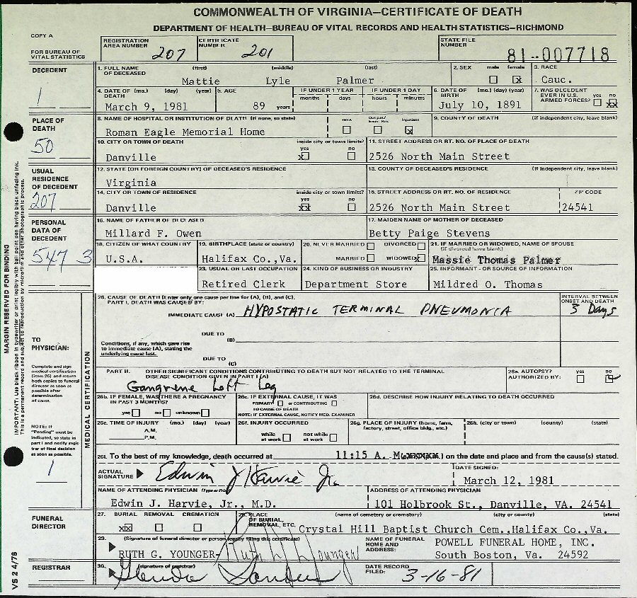 (2) Massie Thomas Palmer February 3, 1940 in Charlotte County, Virginia. (He was born January 27, 1889, Halifax County, Virginia; died July 22, 1965 in South Boston, Halifax County, Virginia; buried Crystal Hill Cemetery, Crystal Hill, Halifax County, Virginia.)