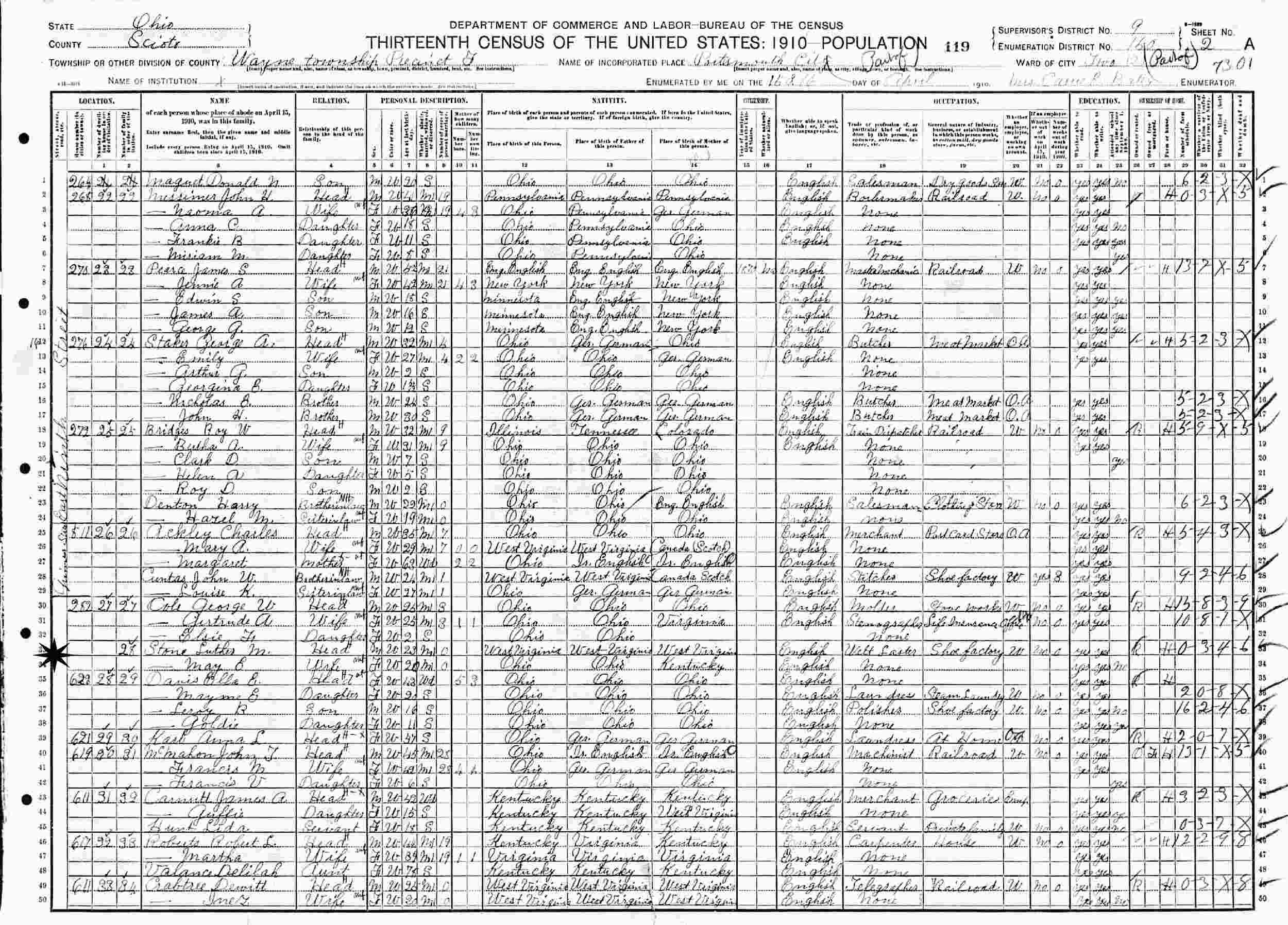 April 15-16, 1910 - Ward 2, Supervisor's District 9, Enumeration District 160, Wayne Township, Portsmouth City, Scioto County, Ohio.