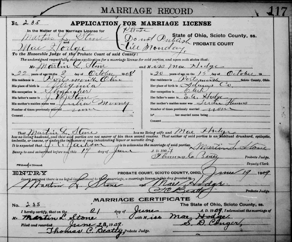 Married: Martin Luther Stone June 21, 1909 in Scioto County, Ohio.