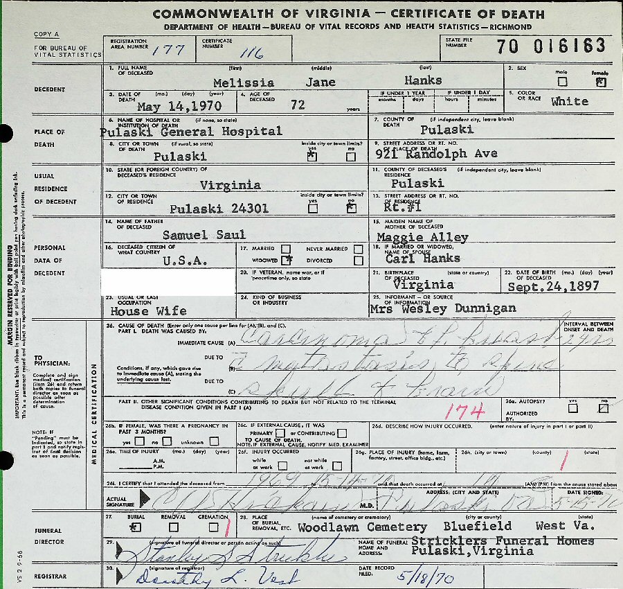 Died: May 14, 1970 in Puaski, Pulaski County, Virginia.