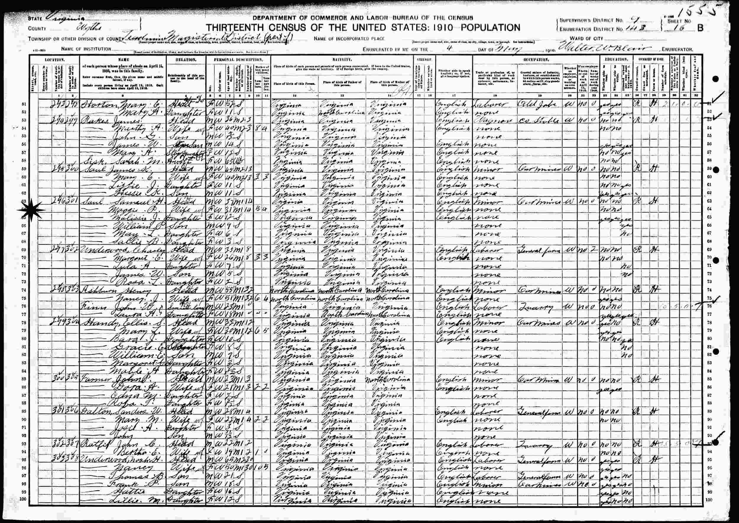 May 4, 1910 - Supervisor's District 9, Enumeration District 143, Lead Mines Magisterial District, Wythe County, Virginia.