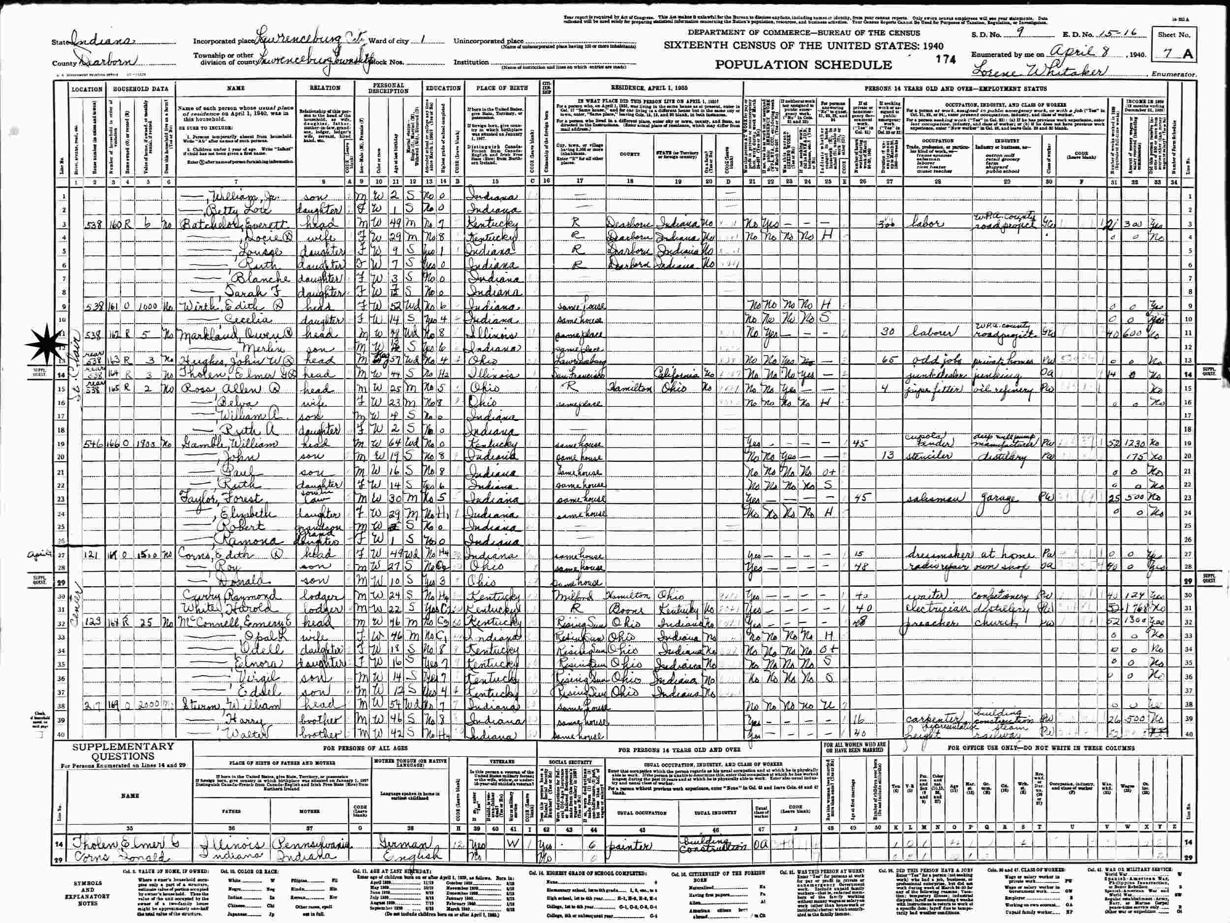 April 8, 1940 - 538 St. Clair, Ward 1, Supervisor's District 9, Enumeration District 15-16, Lawrenceburg Township, Dearborn County, Indiana.