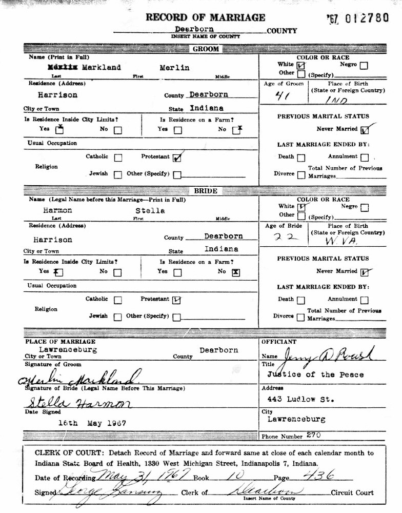 Married: Stella Ann Harmon May 16, 1967 in Lawrenceburg, Dearborn County, Indiana.