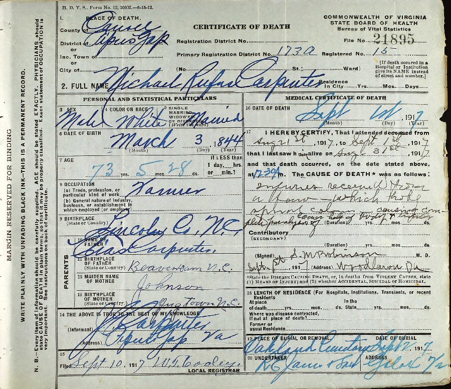 Died: September 1, 1917 in Carroll County, Virginia.