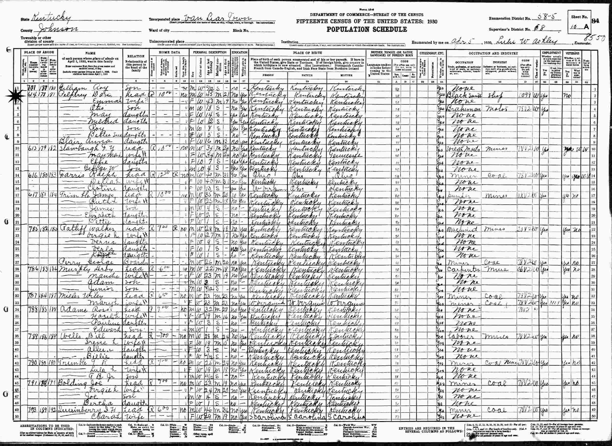 April 5, 1930 - Supervisor's District 58, Enumeration District 58-5, Van Leaer Town, Johnson County, Kentucky.