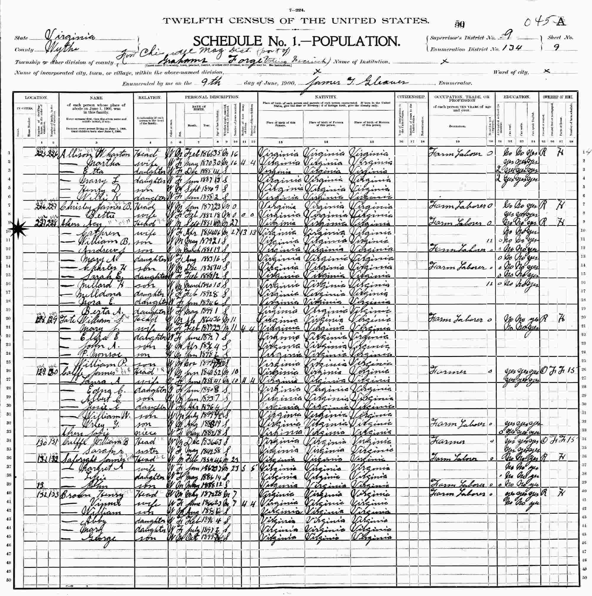 June 9, 1900 in Supervisor's District 9, Enumeration District 134, Grahams Forge Voting District, Wythe County, Virginia.