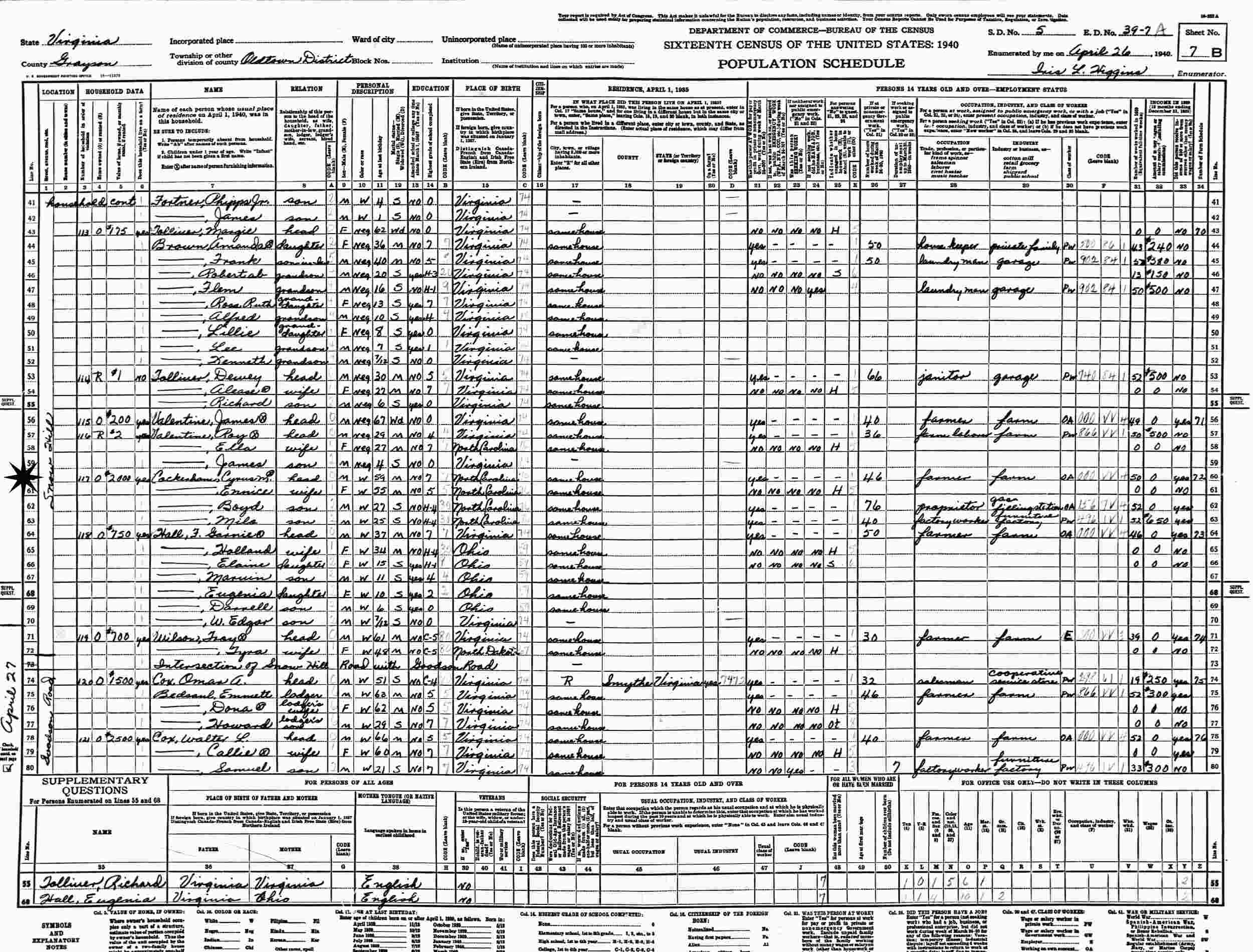 April 26, 1940 - Snow Hill Road, Old Town District, Supervisor's District 5, Enumeration District 39-7, Grayson County, Virginia.