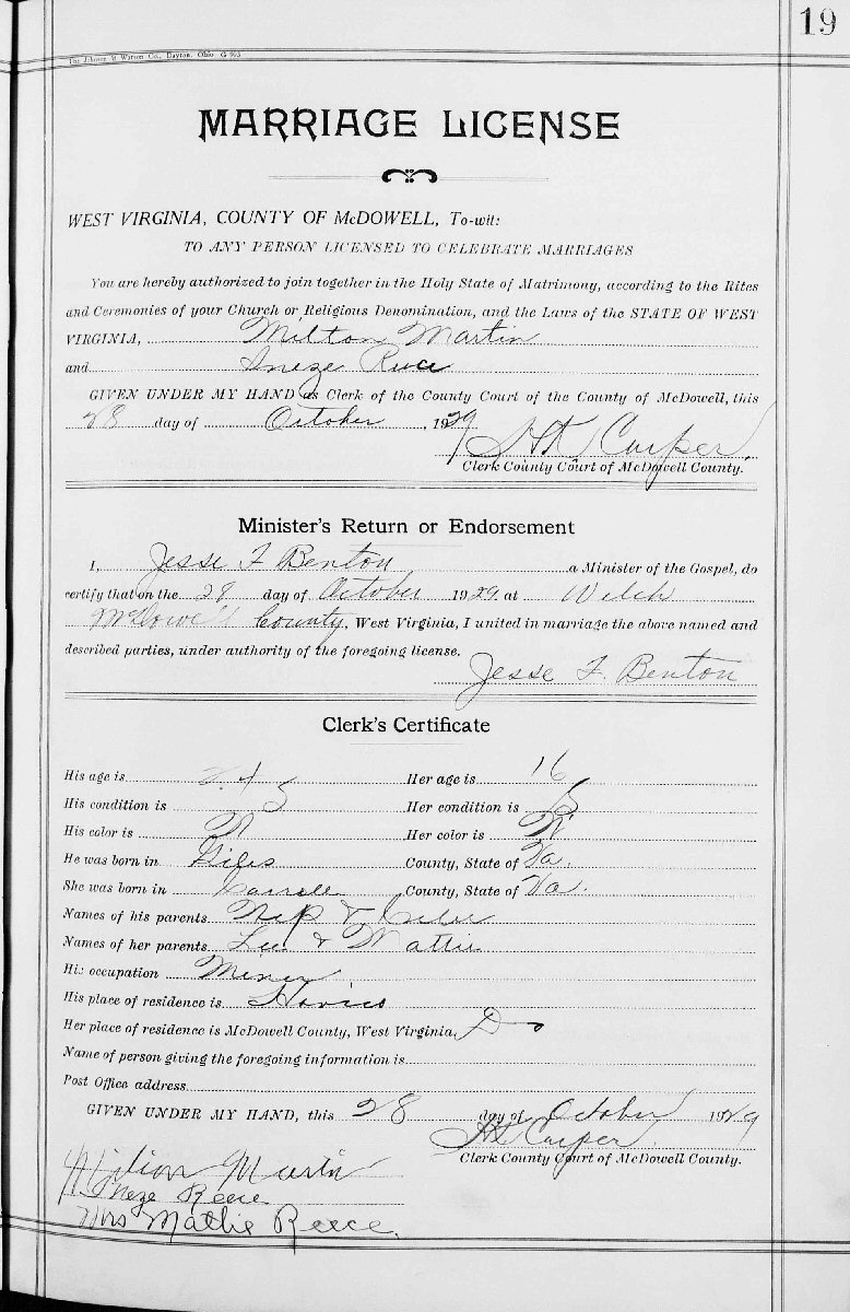 Married: Sylvia Inez Reese October 28, 1929 in Welch, McDowell County, West Virginia.