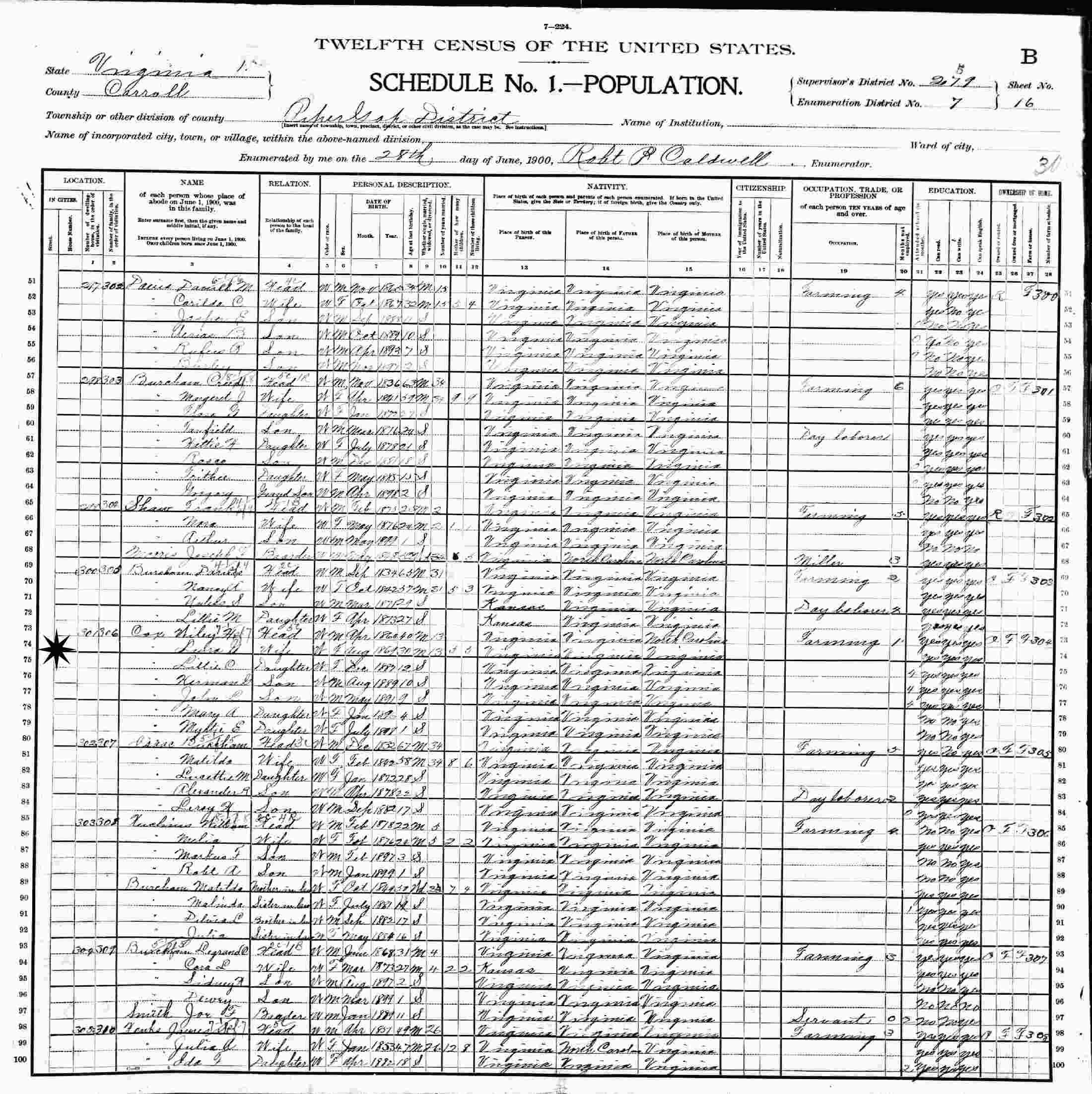 June 28, 1900 - Pipers Gap, Supervisor's District 279, Enumeration District 7, Carroll County, Virginia.