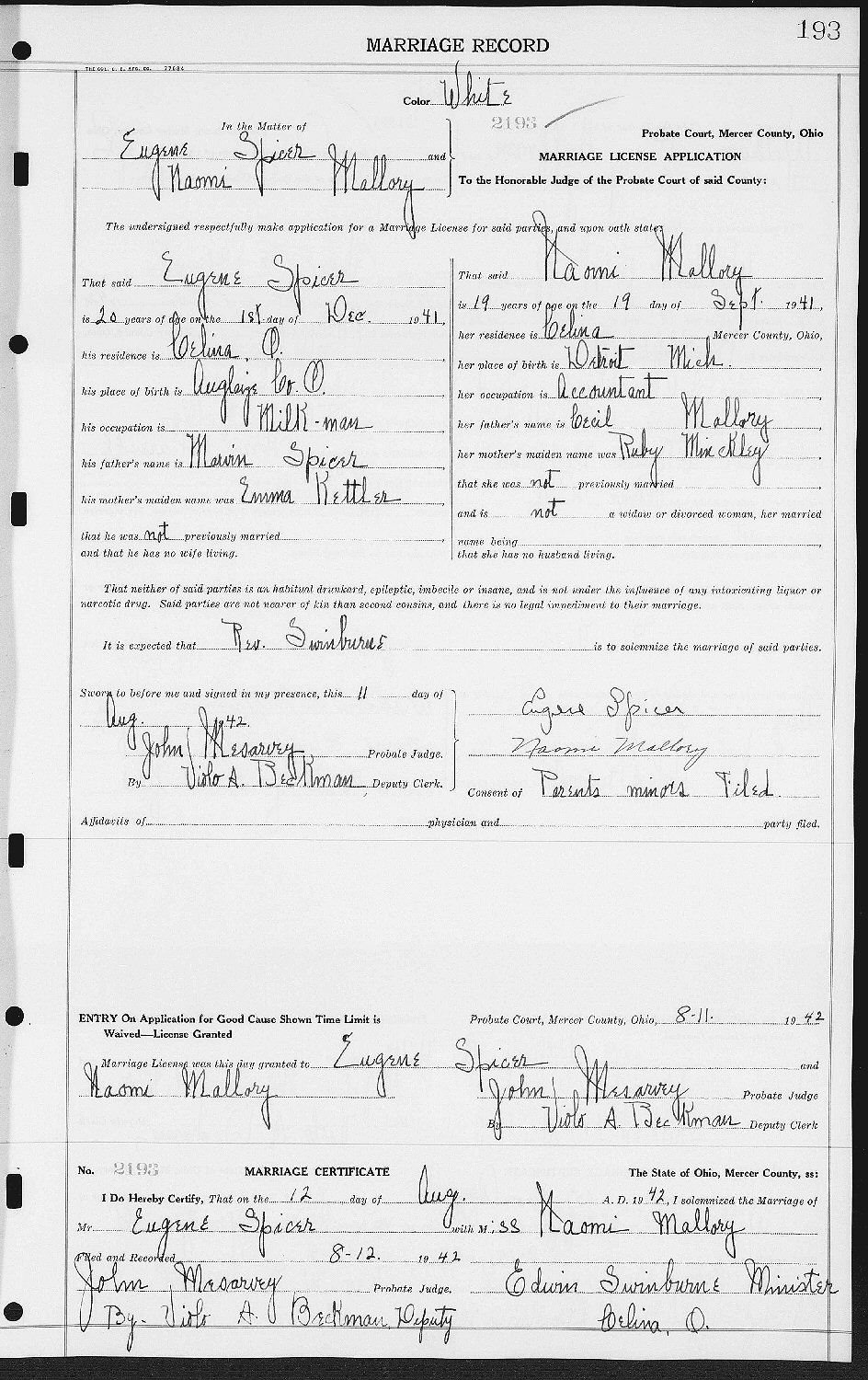 Married: Eugene G Spicer August 11, 1942 in Celina, Mercer County, Ohio.