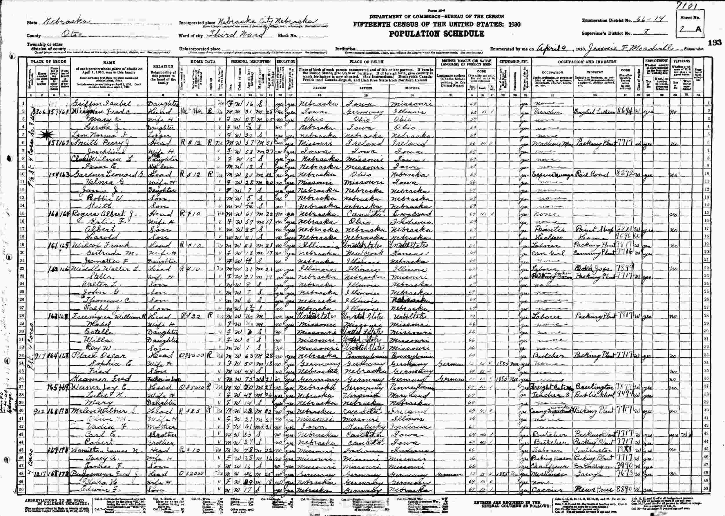 April 9, 1930 - 306 9 1/2 St. 4 Cross S. 9th Street, Third Ward, Supervisor's District 8, Enumeration District 66-14, Nebraska City, Otoe County, Nebraksa (Lodger).