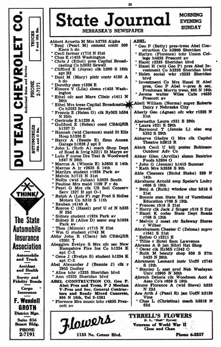 Married: William G Abell 1931-1939 in probably Nebraska.