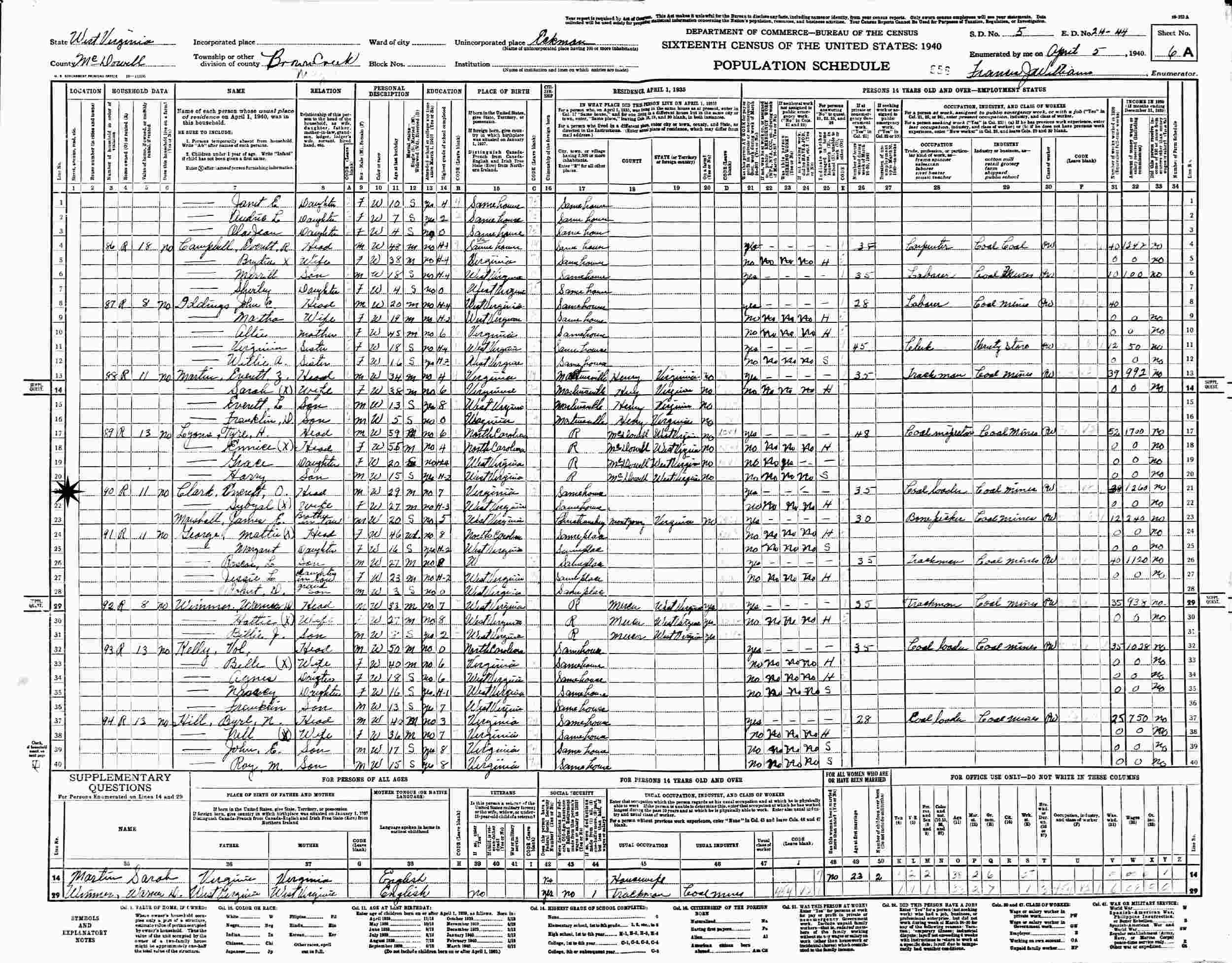 April 5, 1940 - Supervisor's District 5, Enumeration District 24-44, Brown Creek, Eckman, McDowell County, West Virginia.