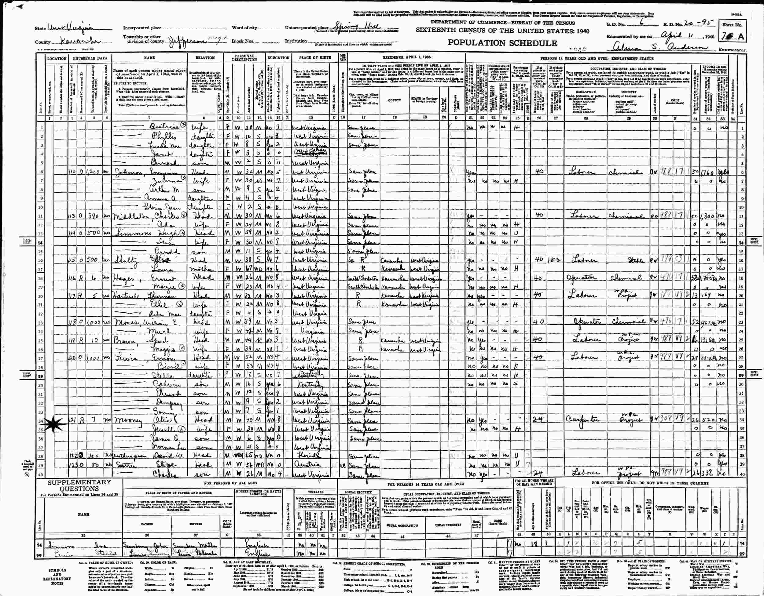 April 11, 1940 - Supervisor's District 6, Enumeration District 20-95, Jefferson Magisterial District, Spring Hill, Kanawha County, West Virginia.