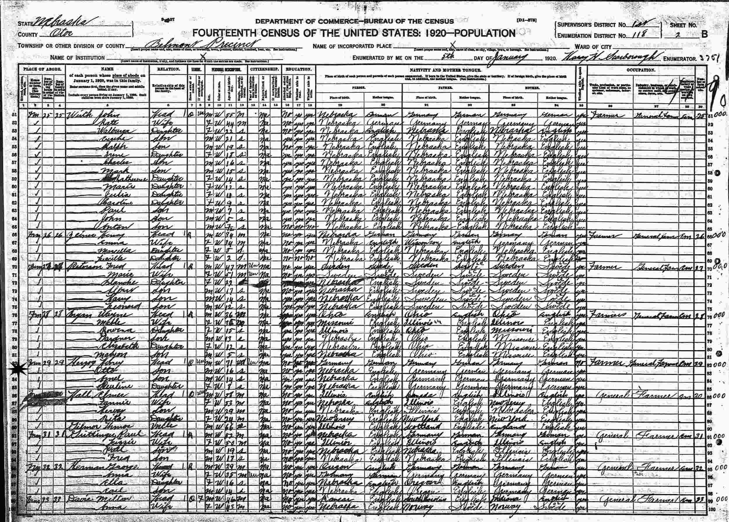 January 5, 1920 - Supervisor's District 1, Enumeration District 118, Belmont Precinct, Otoe County, Nebraska.