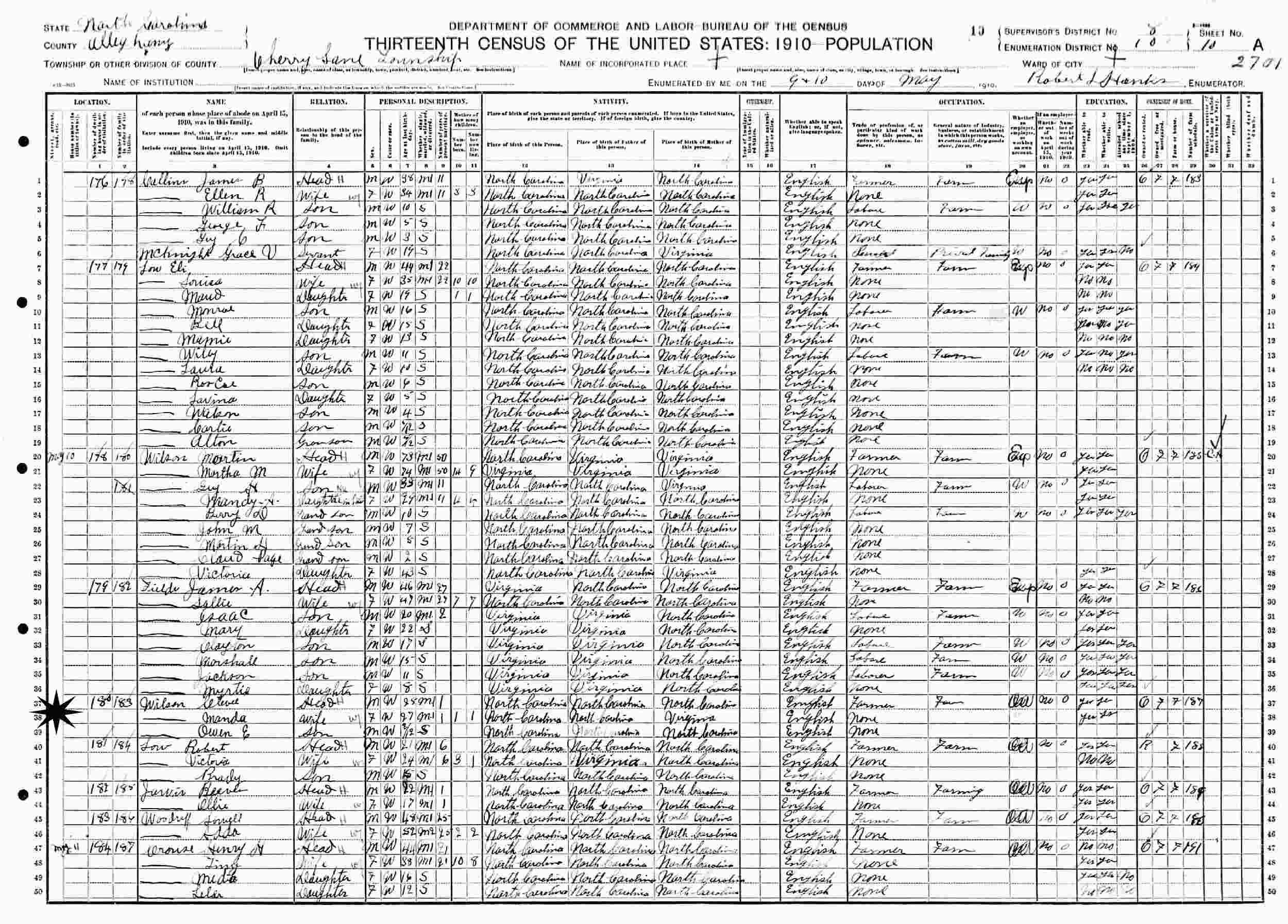 May 9-10, 1910 - Cherry Lane Township, Supervisor's District 8, Enumeration District 10, Alleghany County, North Carolina.