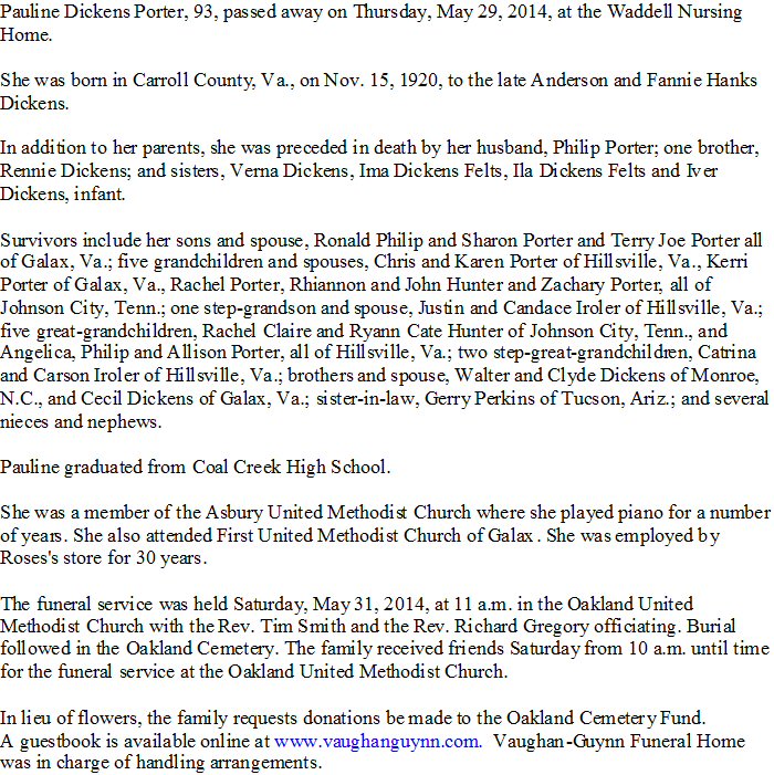 Buried: May 31, 2014 in Oakland United Methodist Church Cemetery, Carroll County, Virginia.