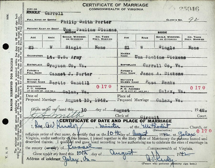 Married: Phillip Smith Porter August 10, 1942 in Galax, Virginia.