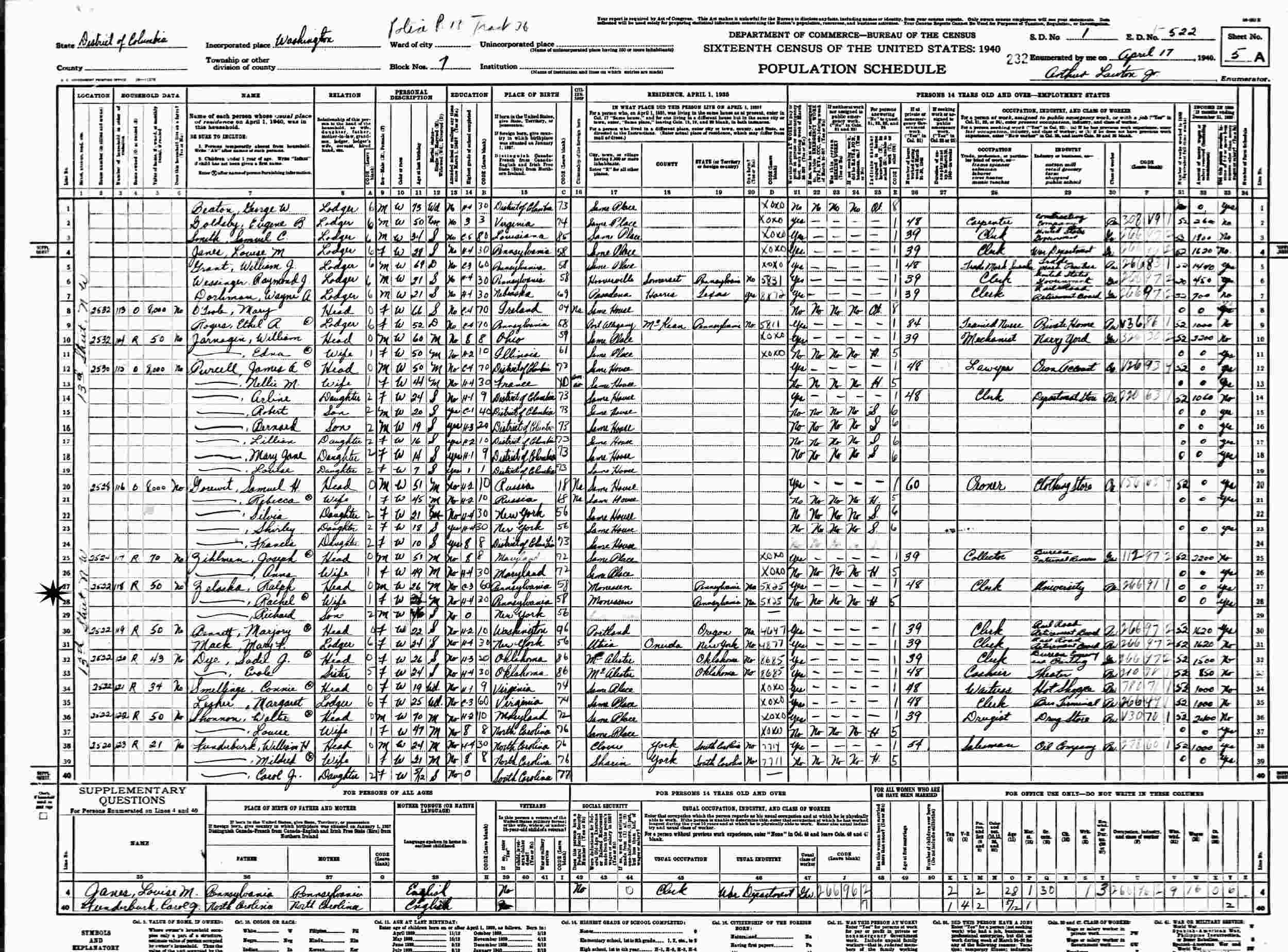 April 17, 1940 - 2522 13th Street N.W., Police Precinct 13, Tract 36, Supervisor's District 1, Enumeration District 522, Washington, D.C.