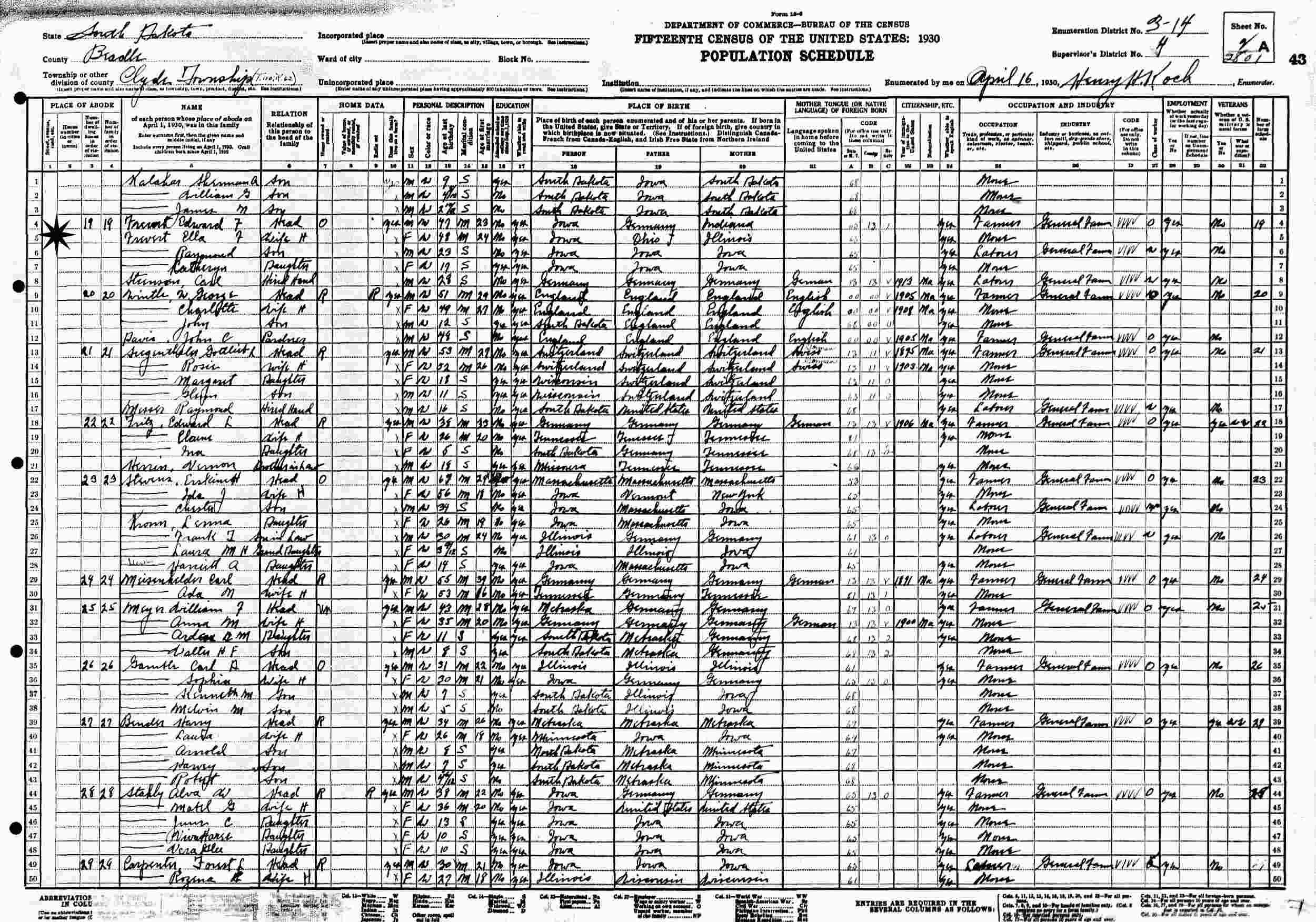 APril 16, 1930 - Clyde, Supervisor's District 4, Enumeration District 3-14, Beadle County, South Dakota.