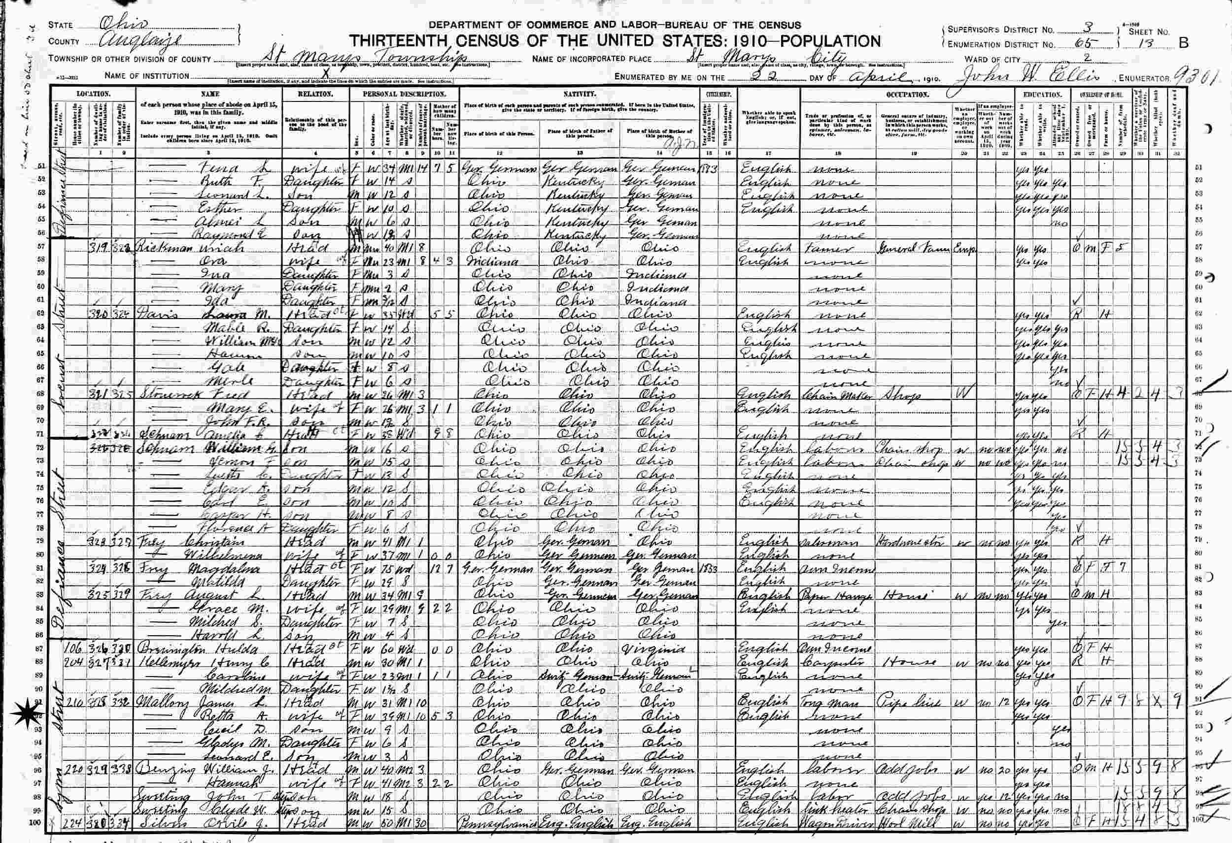 April 22, 1910 - 210 N Lynn Street, Ward 2, Supervisor's District 3, Enumeration District 65, Saint Marys, Auglaize County, Ohio.
