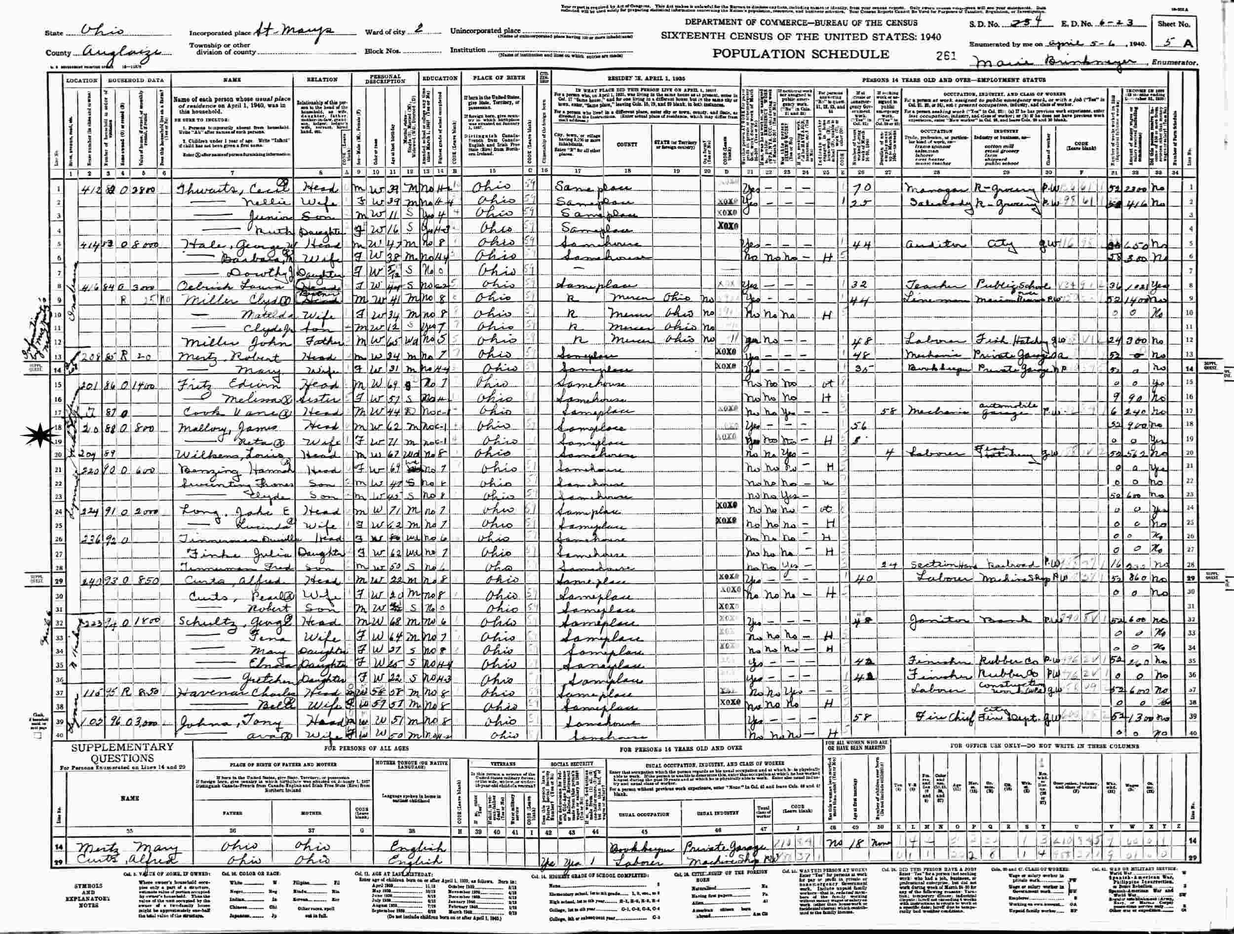 April 5-6, 1940 - 210 Herdock Street, Ward 2, Supervisor's District 23 (crossed out to 4), Enumeration District 6-23, St. Marys, Auglaize County, Ohio.