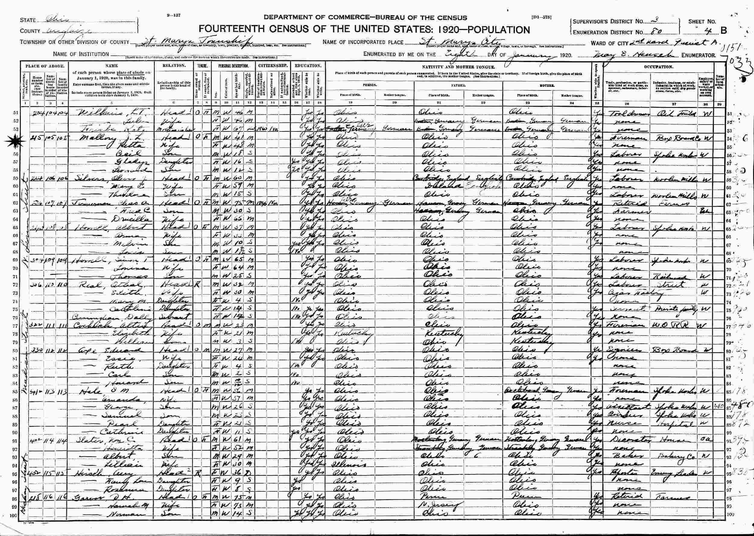 January 8, 1920 - 215 N. Leanin Street, Precinct A, Ward 2, Supervisor's District 3, Enumeration District 80, St. Marys, Auglaize County, Ohio.